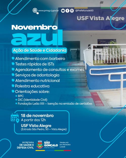 A Unidade de Saúde da Família (USF) de Vista Alegre vai realizar ações de saúde dentro da Campanha Novembro Azul na próxima terça-feira (18), a partir das 12h. Chamada de Novembro Azul – Ação de Saúde e Cidadania, a atividade vai contar com atendimentos já oferecidos na unidade, além de serviços extras para os moradores do local.