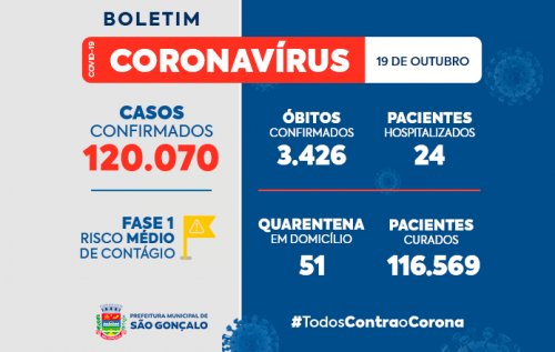 Até o momento, São Gonçalo contabiliza 120.070 casos confirmados, 116.569 curados, 24 hospitalizados na Rede Pública Municipal de Saúde, 51 em quarentena domiciliar, 60 óbitos em investigação e 3.426 óbitos confirmados.