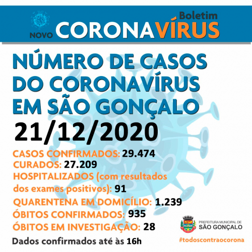 Até o momento, São Gonçalo contabiliza 29.474 casos confirmados, 27.209 curados, 91 hospitalizados na Rede Pública Municipal de Saúde, 1.239 em quarentena domiciliar, 935 óbitos confirmados e 28 óbitos em investigação.