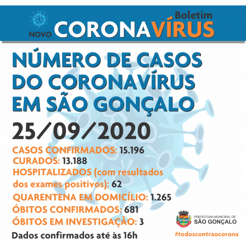Até o momento, São Gonçalo contabiliza 15.196 casos confirmados, 13.188 curados, 62 hospitalizados na Rede Pública Municipal de Saúde, 1.265 em quarentena domiciliar, 681 óbitos confirmados e três óbitos em investigação.