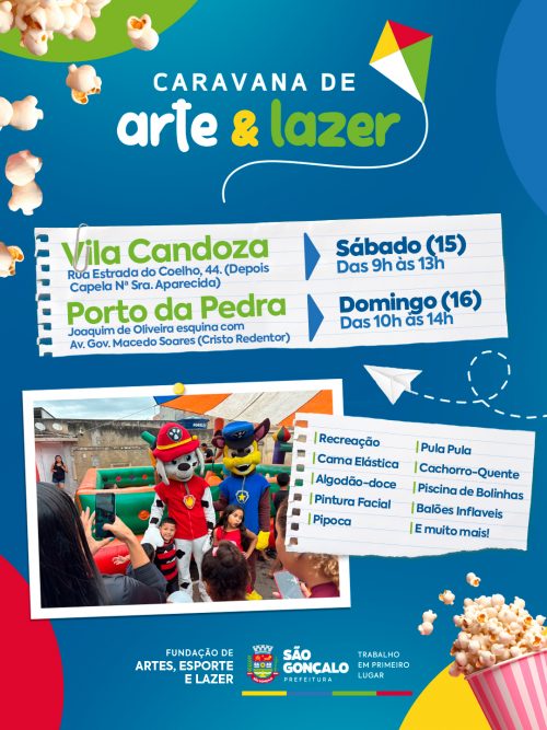As crianças gonçalenses terão mais um fim de semana de diversão e guloseimas com a Caravana de Arte e Lazer. No próximo sábado (15), a ação chega à Vila Candoza e, no domingo (16), ao bairro Porto da Pedra.