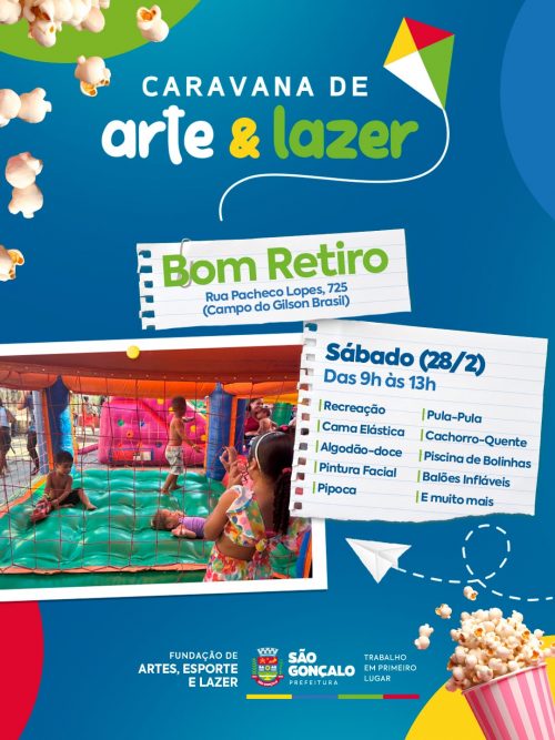 A Caravana de Arte e Lazer acontece sempre aos fins de semana e tem o intuito de promover um momento de lazer e alegria para os gonçalenses de todos os bairros da cidade. A Prefeitura divulga regularmente os locais que vão receber o projeto em seus canais oficiais.