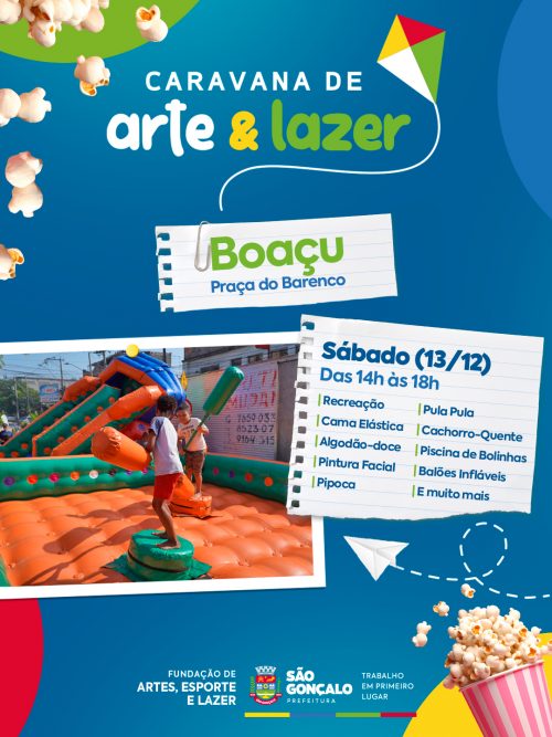 Na tarde deste sábado (13), gonçalenses vão contar com diversas atividades recreativas na Praça do Barenco, no Boaçu. A ação voltada às crianças será realizada pela Caravana de Arte e Lazer, da Fundação de Artes, Esporte e Lazer de São Gonçalo (Faelsg).