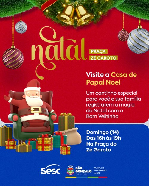 No próximo domingo (14), a praça do Zé Garoto ganha um novo cantinho natalino. Os gonçalenses poderão visitar a casa do Papai Noel. O bom velhinho estará no local, das 16h às 19h, para alegria das famílias gonçalenses, que poderão registrar o momento encantado com fotos.