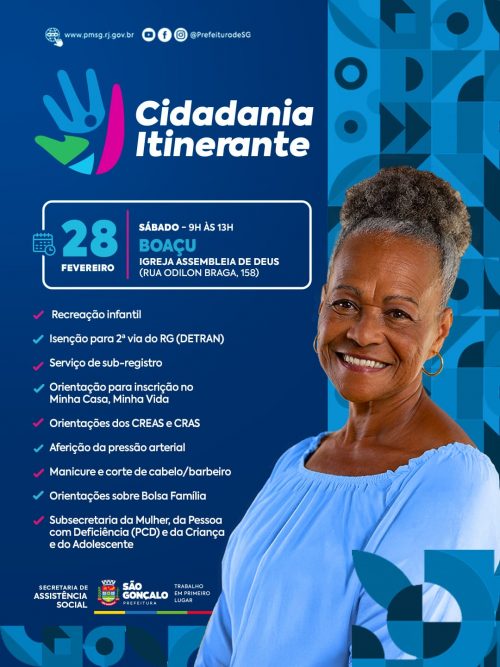No próximo sábado (28), a Secretaria de Assistência Social da Prefeitura de São Gonçalo vai levar uma edição do Cidadania Itinerante para o bairro Boaçu, na Rua Odilon Braga, nº 158, das 9h às 13h.
