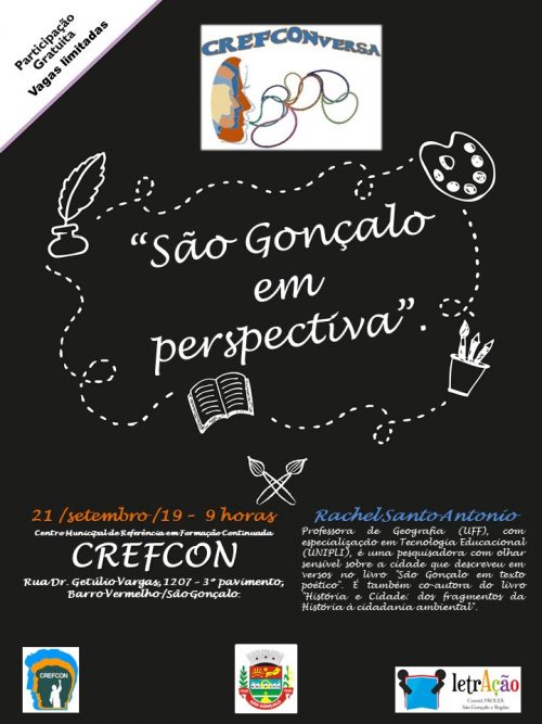 A edição do Crefconversa de setembro será diferente. Neste sábado (21), o tema do encontro será “São Gonçalo em Perspectiva”, com a professora e poeta Rachel Santo Antonio. O evento integra o conjunto de atividades comemorativas do aniversário da cidade.