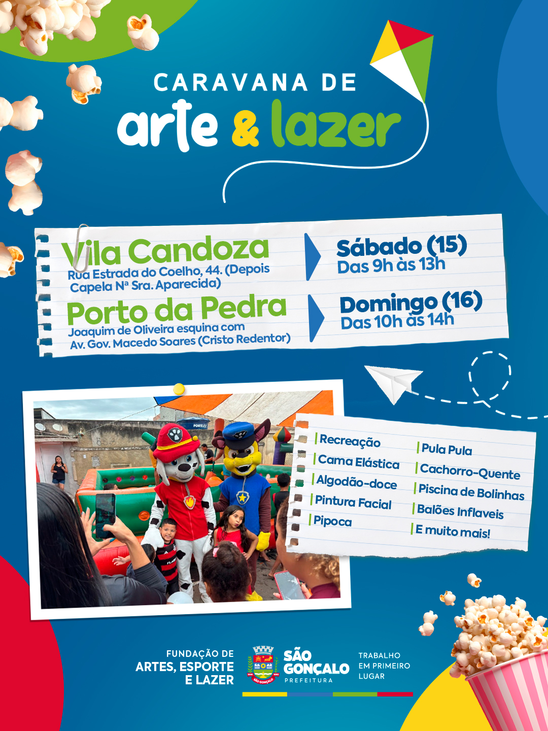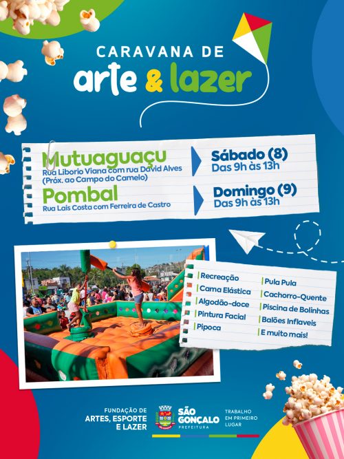 Para animar o fim de semana da criançada, a Caravana de Arte e Lazer vai levar brincadeiras e lanches para os moradores do Mutuaguaçu e do Pombal. No sábado (8), a ação ocorre junto ao evento da entrega das obras de infraestrutura do Mutuaguaçu, Mutuá e Porto do Rosa. Já no domingo (9), a caravana desembarca na região do Pombal, no bairro Porto Novo.