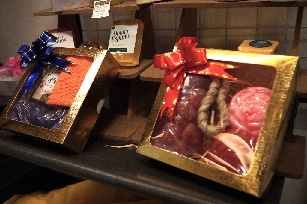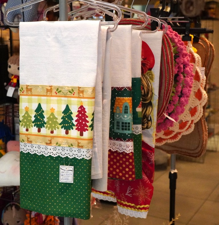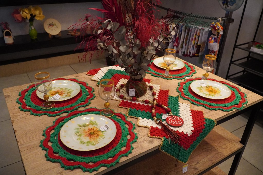 Além das opções de presentes, o espaço ainda possui muitos artigos natalinos, como toalhas de mesa temáticas, guirlandas e presépios artesanais, para utilizar durante a festividade.
