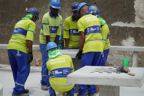 Nesta segunda-feira (24), está sendo feita a instalação e fixação dos mobiliários, que incluem bancos e mesas de concreto, além da finalização da pintura da estrutura metálica das duas quadras com um produto que impede ferrugem no material. A arquibancada foi finalizada e será construída uma rampa para as pessoas com deficiência (PcDs) que quiserem acessar a quadra de basquete. A praça também receberá paisagismo.