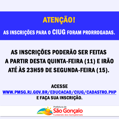 O processo de pré-matrícula online para ingresso e permanência no Centro Interescolar Ulysses Guimarães (Ciug) foi prorrogado até as 23h59 da próxima segunda-feira (15). Os candidatos devem acessar o site da Prefeitura (www.pmsg.rj.gov.br) e preencher o formulário para realizar a inscrição.