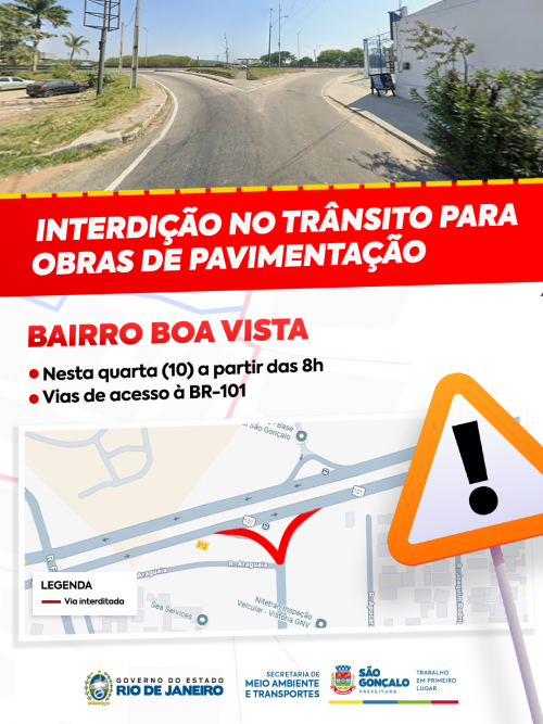 A Secretaria de Meio Ambiente e Transportes da Prefeitura de São Gonçalo realizará, nesta quarta-feira (10), a partir das 8h, uma interdição provisória na Avenida Governador Agamenon Magalhães, no bairro Boa Vista, para a realização das obras de recuperação de pavimentação na via. A interdição total terá duração enquanto a intervenção estiver em andamento.
