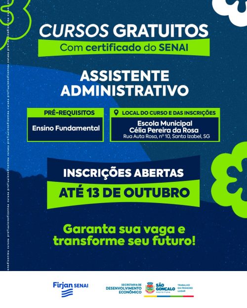 A Secretaria de Desenvolvimento Econômico da Prefeitura de São Gonçalo está oferecendo vagas para o curso profissionalizante de assistente administrativo, em parceria com a Firjan/Senai. Totalmente gratuito, o curso será realizado na Escola Municipal Célia Pereira da Rosa, em Santa Izabel.