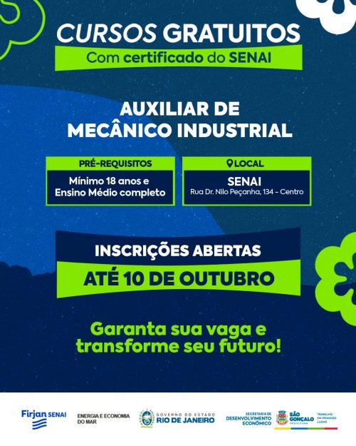 A Secretaria de Desenvolvimento Econômico da Prefeitura de São Gonçalo, em parceria com a Secretaria de Estado de Energia e Economia do Mar (Seenemar), está disponibilizando vagas para o curso profissionalizante gratuito de auxiliar de mecânico industrial. Os interessados podem se inscrever de forma online até a próxima sexta-feira (10).