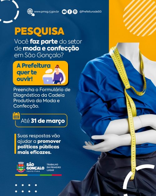 A Prefeitura de São Gonçalo, por meio da Secretaria de Desenvolvimento Econômico, abriu novo prazo para os profissionais que atuam nos setores de moda e confecção da cidade se cadastrarem junto ao município. Os profissionais podem se cadastrar até o dia 31 de março, de forma totalmente online. O principal objetivo do cadastro é fazer um levantamento dos profissionais, entendendo suas demandas e criando políticas públicas voltadas a eles.