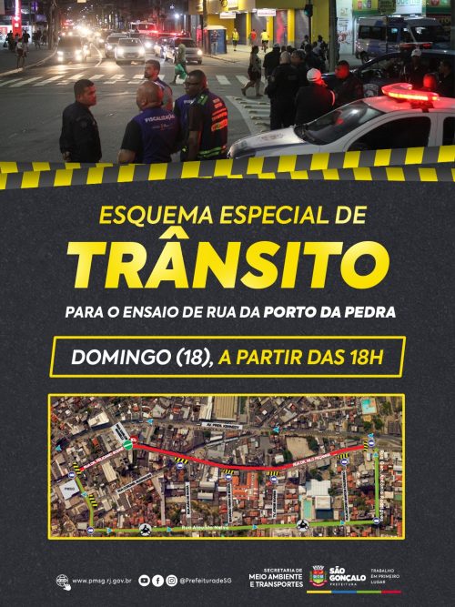 A Secretaria de Meio Ambiente e Transportes da Prefeitura de São Gonçalo publicou no Diário Oficial desta quinta-feira (15) um esquema especial de trânsito para o próximo domingo (18), quando acontecerá o ensaio de Unidos do Porto da Pedra, no Centro de São Gonçalo. As intervenções serão temporárias, tendo início às 18h e seguindo até o fim do evento. Confira as mudanças a seguir: