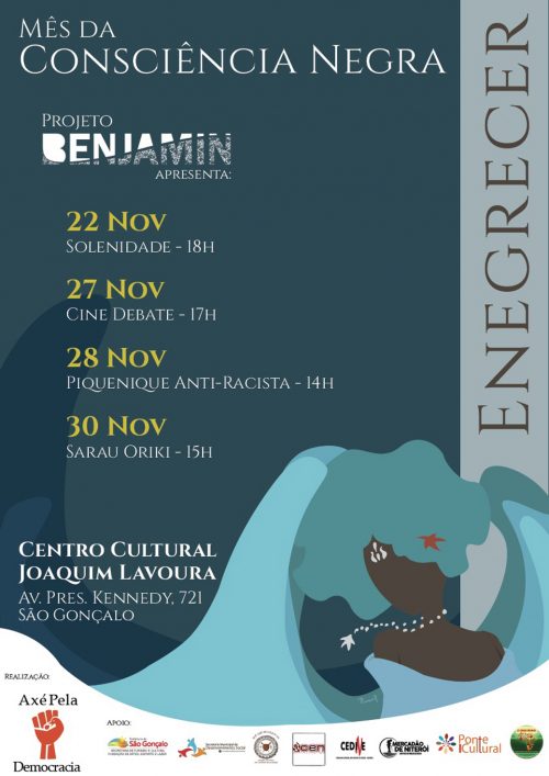 Nos dias 22, 27, 28 e 30 de novembro, o Projeto Benjamin / Enegrecer vai promover uma série de atividades socioculturais em prol do Mês da Consciência Negra, no Centro Cultural Joaquim Lavoura (Lavourão). A iniciativa tem o apoio da Secretaria de Turismo e Cultura (SMTC) e da Fundação de Artes, Esporte e Lazer de São Gonçalo (FAESG). Todos os dias do evento terão ingresso gratuito e a classificação etária é livre.