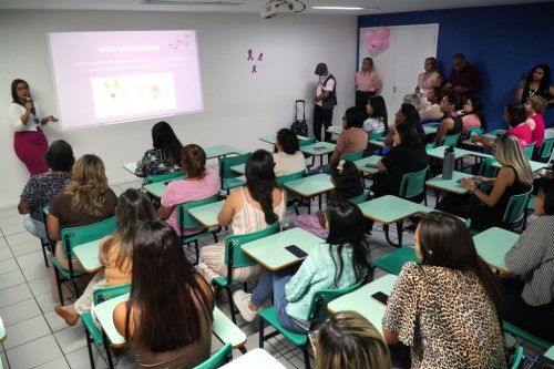 Ela também mostrou as alterações que ocorrem na mama relacionadas ao câncer de mama para as servidoras ficarem atentas. “Se observarem inchaço ao redor da mama, dor no mamilo, secreção, mamilo invertido, aspecto enrugado e nódulos, vocês devem procurar atendimento o quanto antes. Esses são alguns dos sintomas que a gente consegue identificar com muita facilidade. Se a gente não se cuida, a gente sofre as consequências depois. E os cuidados devem ser durante todo o ano, mesmo sem sentir qualquer sintoma”, finalizou.