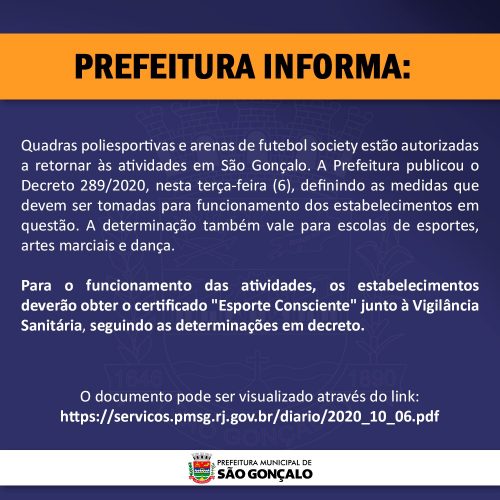 As regras para obtenção do certificado “Esporte Consciente” podem ser visualizadas através do Diário Oficial, no link: https://servicos.pmsg.rj.gov.br/diario/2020_10_06.pdf