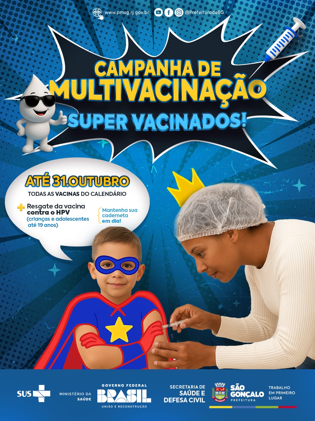 A Secretaria de Saúde da Prefeitura de São Gonçalo começa, nesta segunda-feira (6), a Campanha Nacional de Multivacinação para atualização da caderneta de vacinação. Responsáveis pelas crianças e adolescentes de 0 a 14 anos, 11 meses e 29 dias devem procurar um dos 59 postos de saúde receber os imunizantes. A vacina contra o HPV também está disponível para os adolescentes entre 15 e 19 anos que ainda não se vacinaram. A campanha segue até o dia 31 de outubro e terá o Dia D no dia 18 de outubro.