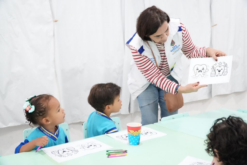 A ação foi em alusão aos dias da criança, do professor e do dentista – todos comemorados neste mês de outubro – e teve como propósito incentivar hábitos saudáveis de saúde bucal desde criança. A subsecretária de Odontologia da Secretaria de Saúde da Prefeitura de São Gonçalo, Ana Gabriela Franco, também lembrou de reforçar a importância da prevenção.