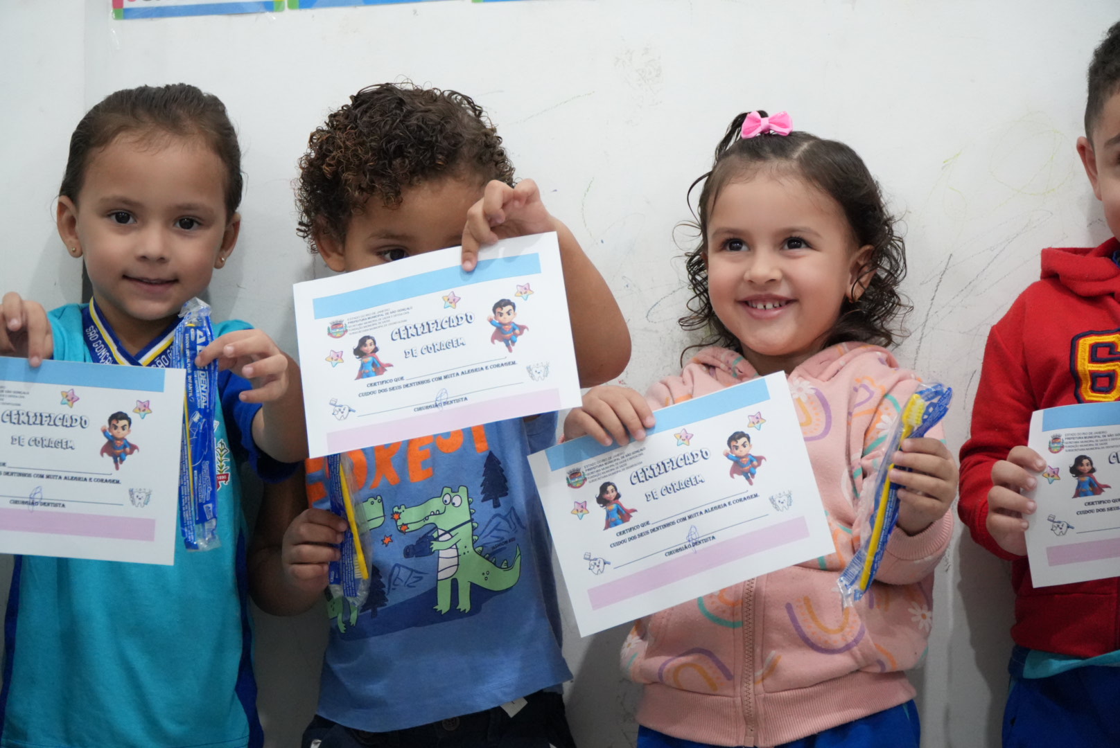 As crianças de 2 a 4 anos participaram das atividades por grupos. Ao todo, 134 estudantes iam passar pelas brincadeiras lúdicas, que misturam diversão e aprendizado. Todas as crianças que participaram ganharam certificado de coragem, escova dental e kit de colorir.