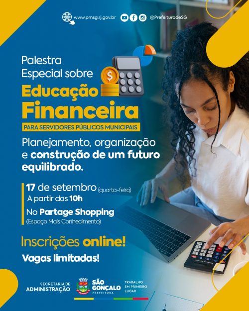 A Secretaria de Administração da Prefeitura de São Gonçalo, em parceria com o Banco Itaú, vai realizar uma Palestra Especial sobre Educação Financeira, destinada exclusivamente aos servidores públicos municipais de São Gonçalo. O encontro acontece na próxima quarta-feira (17), às 10h, no Espaço Mais Conhecimento, localizado no 2 piso do Partage Shopping, no Centro da cidade.
