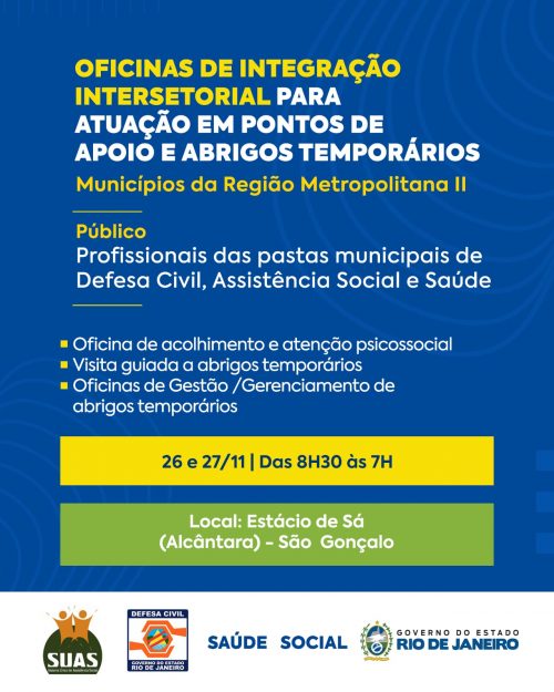 Promovidas em parceria com a Secretaria de Estado de Defesa Civil do Rio de Janeiro (Sedec/RJ) e a Secretaria de Estado de Saúde (SES/RJ), as oficinas têm como foco a capacitação de equipes técnicas das nove regiões do Estado no campo da gestão de abrigos provisórios. A ação integra a estratégia estadual de prevenção e enfrentamento a situações de calamidades públicas e emergências, fortalecendo o Serviço de Proteção em Calamidades Públicas.