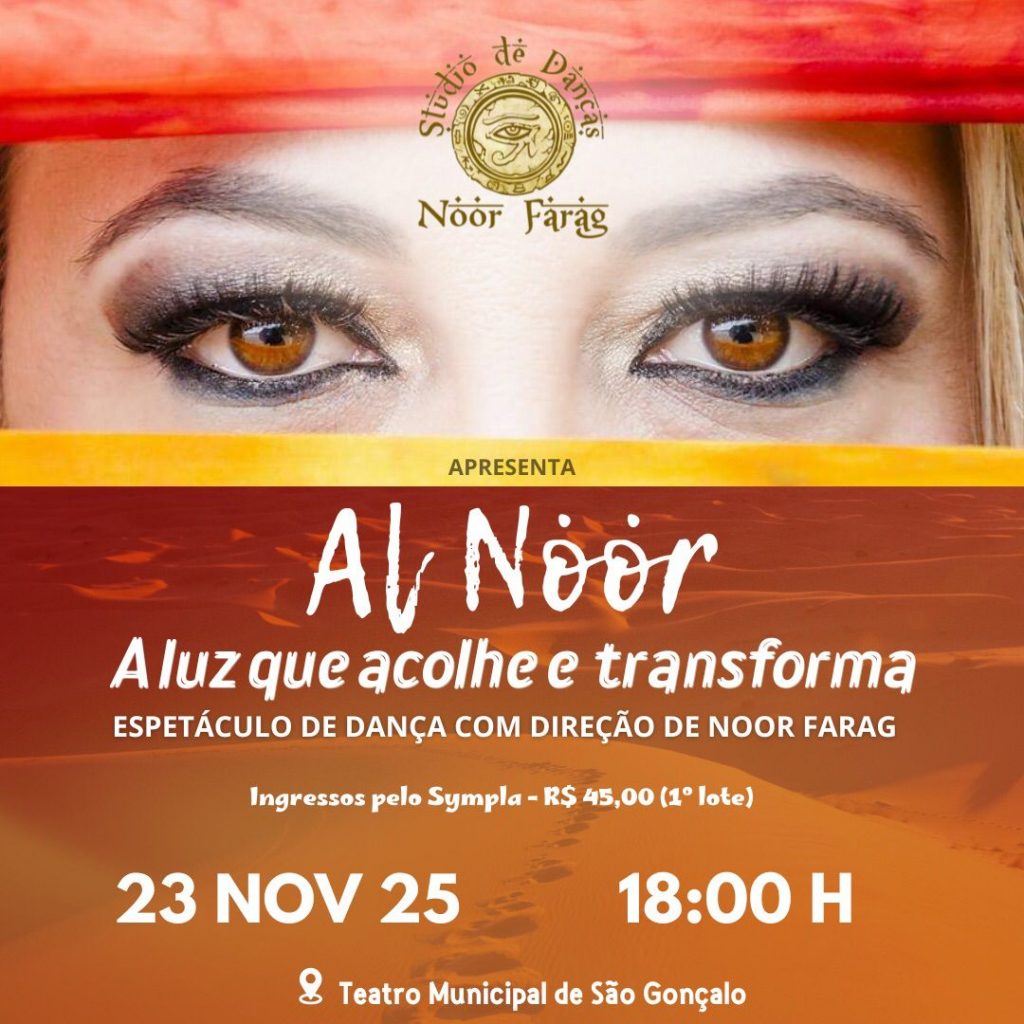 No domingo (23), às 18h, será a vez do espetáculo de dança “Al Noor: A Luz que Acolhe e Transforma”. Dirigido por Noor Farag, o evento propõe um encontro entre o Oriente e o Ocidente, celebrando a dança do ventre e outras formas de expressão artística que iluminam e acolhem a alma. A classificação é livre e os ingressos podem ser adquiridos antecipadamente pelo link: https://www.sympla.com.br/evento/al-noor-a-luz-que-acolhe-e-transforma/3187248